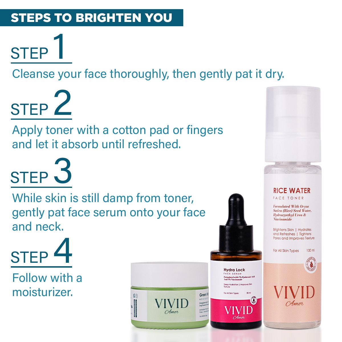 For best results, use the toner twice daily (morning and night), the serum after toning, and the moisturizer after the serum.