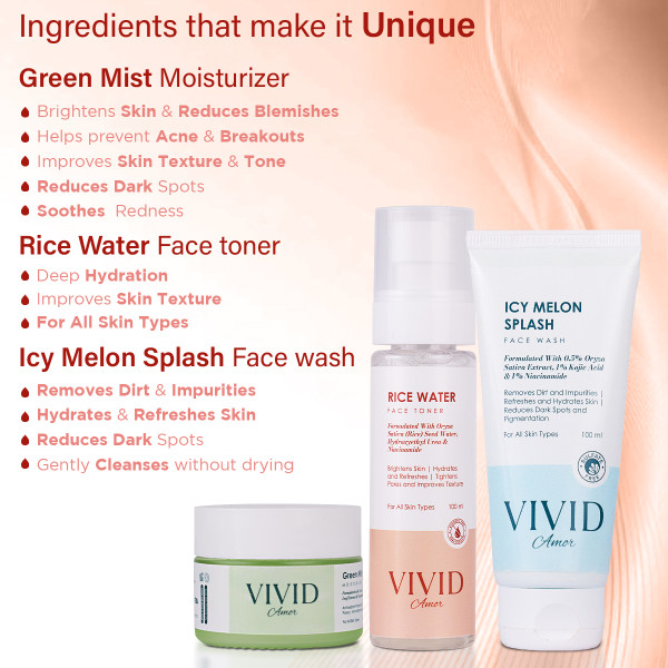 Reveal your most radiant, healthy skin with our CTM Combo (Icy melon splash, Rice water toner & Green mist moisturizer) — a thoughtfully crafted trio that cleanses, tones, and moisturizes for balanced, luminous skin every day. This routine works synergistically to brighten dull skin, fade dark spots, and even out your complexion. Your daily dose of clarity, hydration, and glow — in one perfect combo.