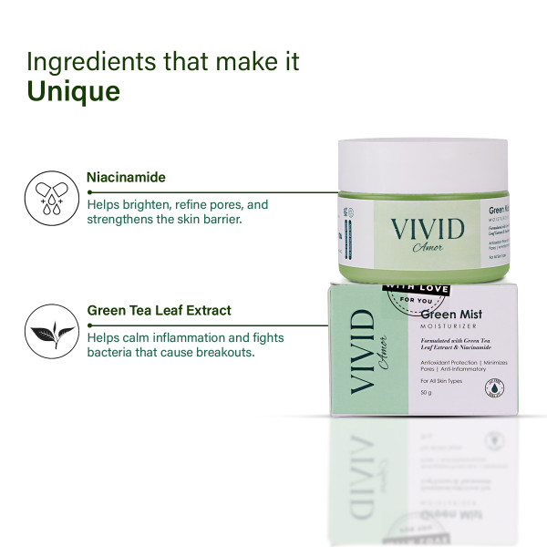 Daily stress, pollution, and excess oil can leave your skin peeling off, irritated, shiny, or just not its best. That's where Green Mist Moisturizer comes in, specially made to give your skin that calm, clean feeling it craves. Infused with green tea and niacinamide, this lightweight formula hydrates, soothes redness, controls oil, and smooths texture, making it ideal for oily and sensitive skin.