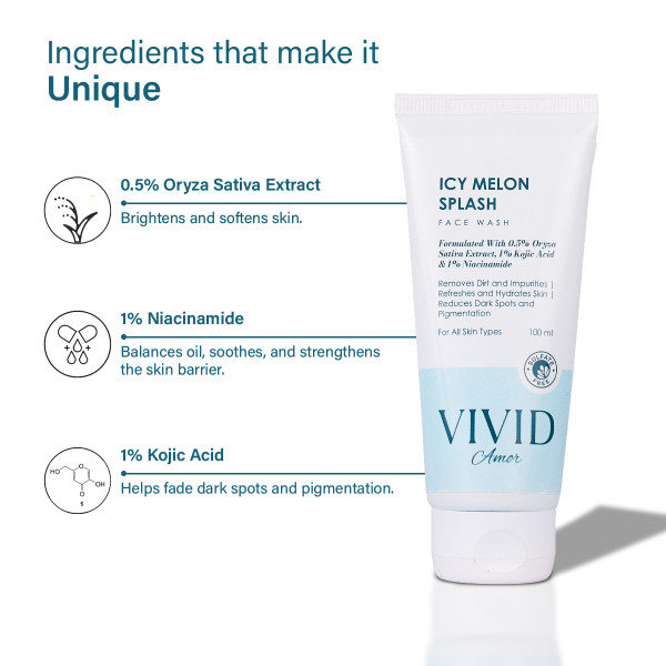 A regular face wash isn't enough when your skin feels oily, dull, or tanned; it needs a refreshing boost. Icy Melon Splash is made to do just that. With the goodness of rice water, kojic acid, and niacinamide, it gently removes dirt, tan, and dark spots while giving your skin a bright and even look. It’s also designed to be gentle on your skin, cleansing without drying it out, so your face feels soft, fresh, and hydrated after every wash.